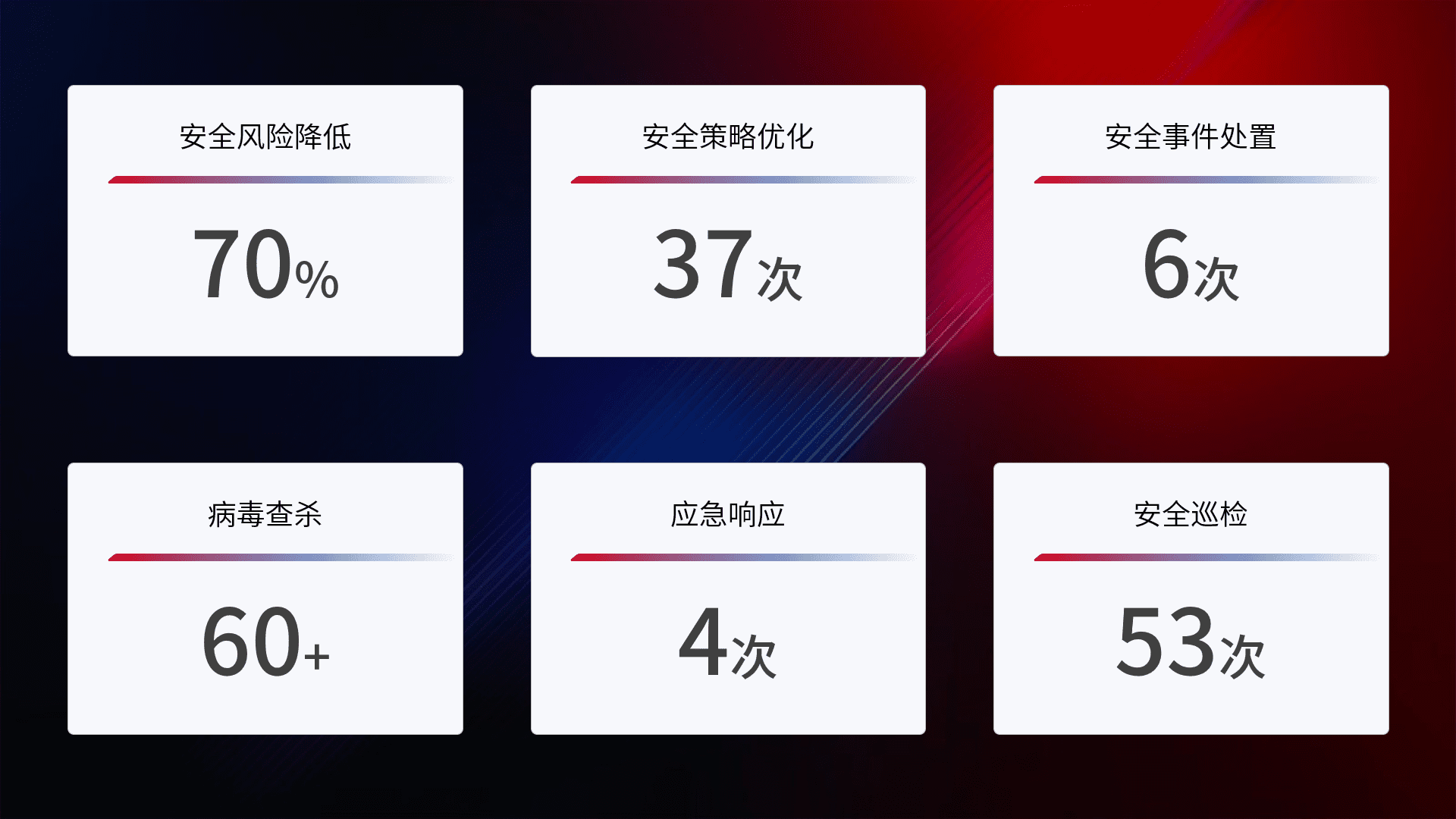 提供全面的安全事件报告体系,,,,包括处置报告、、、、周报、、、季度和年度总结,,,,结合持续监控,,帮助客户深入了解网络安全状况。。。