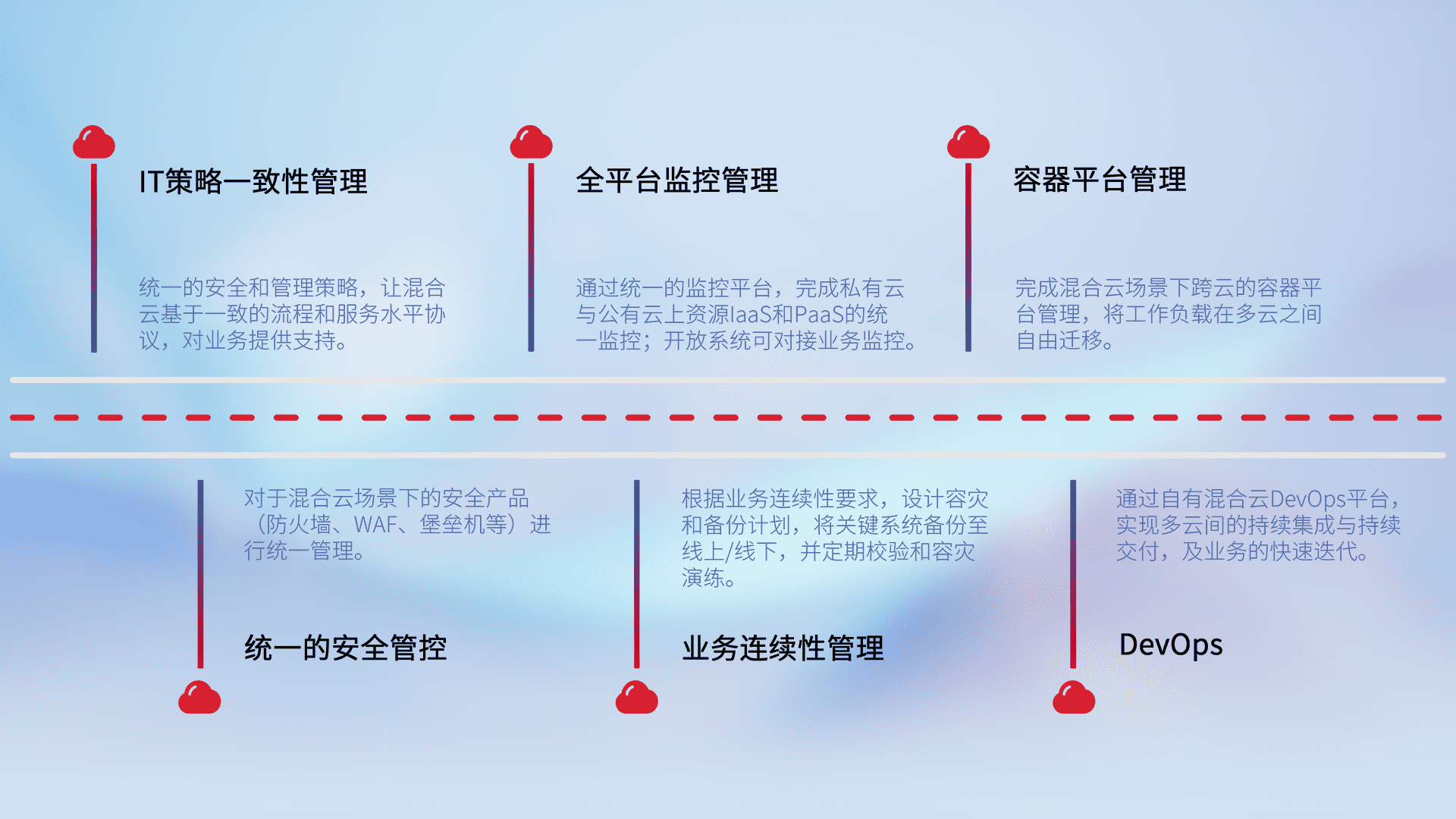 通过多云纳管,,,,以统一的资源数据模型把客户的云资源进行抽象和封装,,,进而实现对多云资源的统一操作,,保障云资源管理的可靠性、、稳定性与可用性。。。量身定制化运维内容,,,,配置、、、开发运维、、、补丁管理、、、、备份、、、、监控、、、、认证和访问管理、、、审计和日常巡检等,,保障在用云过程中的可靠度,,稳定度以及高可用率。。